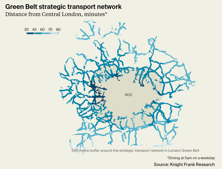 In exploring opportunities for industrial intensification or relocation within the grey belt, Knight Frank’s Geospatial team has identified 1,178 hectares of previously developed land in London’s Green Belt that lies within 500 metres of a major road (either a motorway or A road). Of this, 167 hectares is located within a 45-minute drivetime of Central London. This suggests that finding potential sites should not be difficult.
