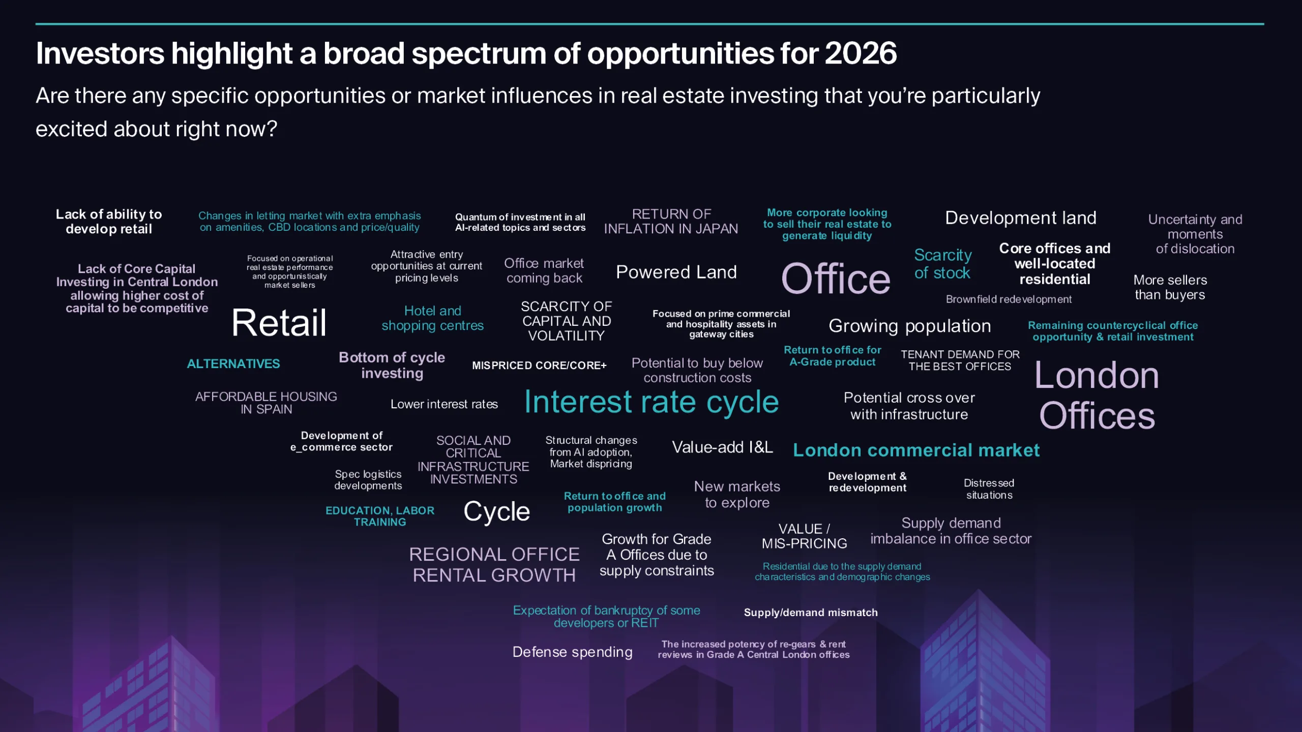 Core/Core Plus repricing and distressed situations also form survey respondent free-text responses. Opportunities include sale and leasebacks, bottom-of-cycle acquisitions and assets trading below construction cost. Scarcity of core capital in Central London is also cited as allowing higher cost-of-capital buyers to compete, while motivated sellers in secondary markets offer opportunistic upside. However, as our survey finds, this scarcity of core capital is set to abate in 2026.
