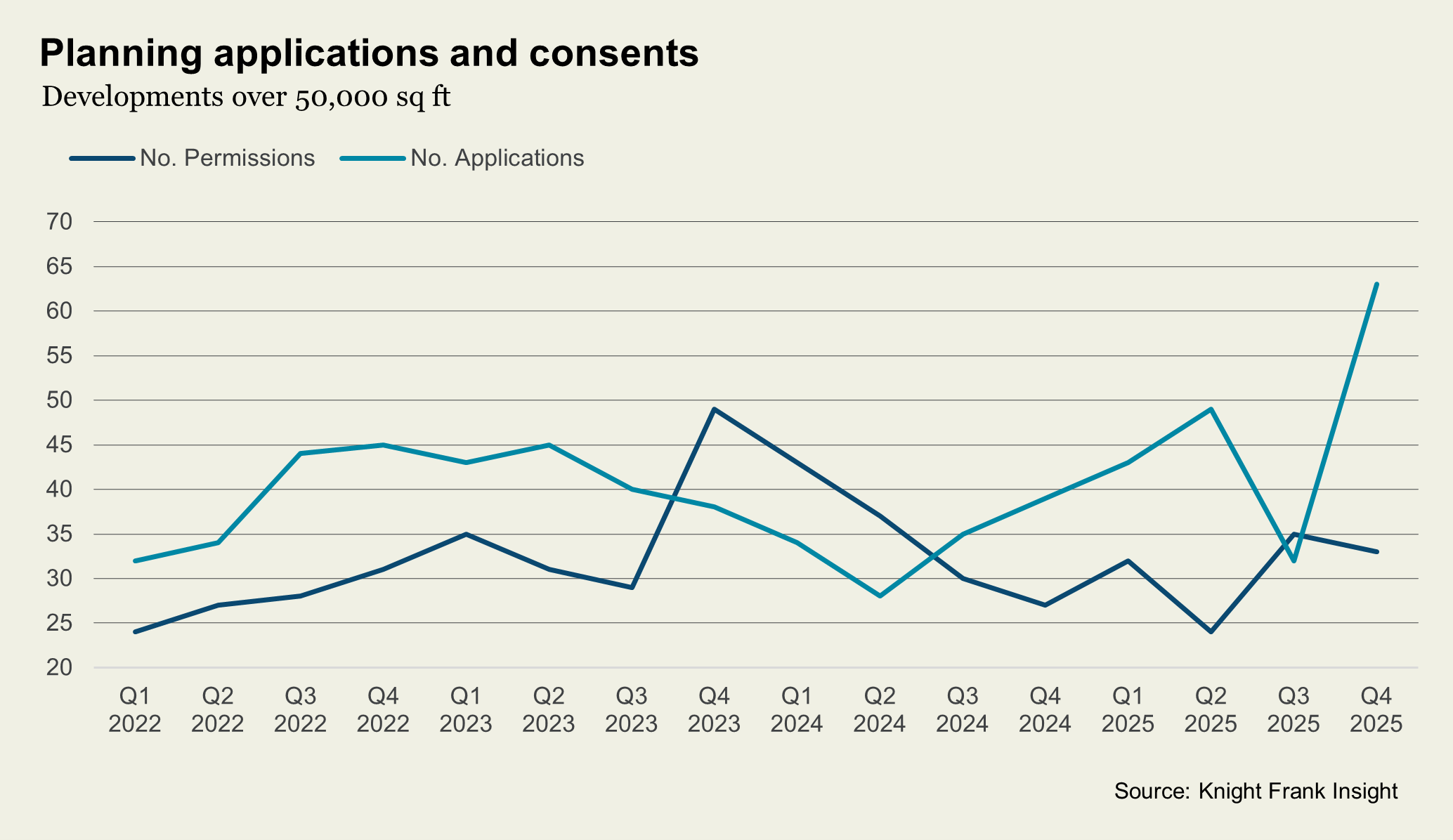 For industrial and logistics units over 50,000 sq ft, only 32 planning applications were submitted in Q3 2025. However, Q4 saw a notable rebound, with applications rising to 63, almost double the previous quarter. So far in Q1 2026, 24 applications have been recorded.
