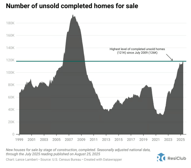 Official figures for July – which look to be the latest available – put the number of unsold and completed new homes at 121,000, which is the highest since 2009. Single-family home starts are running at two-and-a-half-year lows. Chart courtesy of ResiClub.