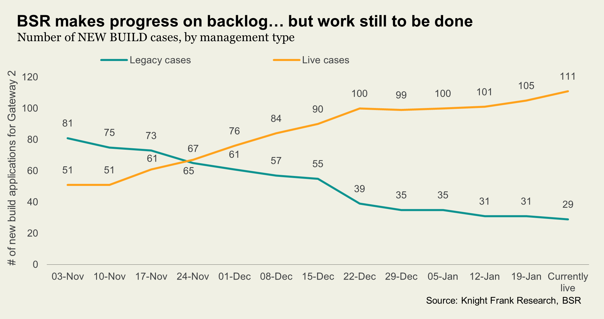 Delays at the Building Safety Regulator remain a significant blocker to the delivery of high-rise, high-density housing. However, while challenges remain clearer guidance, better resourcing and a more proportionate approach to approvals have begun to reduce bottlenecks. Indeed, the latest data from the Build Safety Regulator shows legacy new build cases across the UK are down from 81 in November to 29 at the end of January, while decision times have fallen from 37 weeks last year to just 13 now.