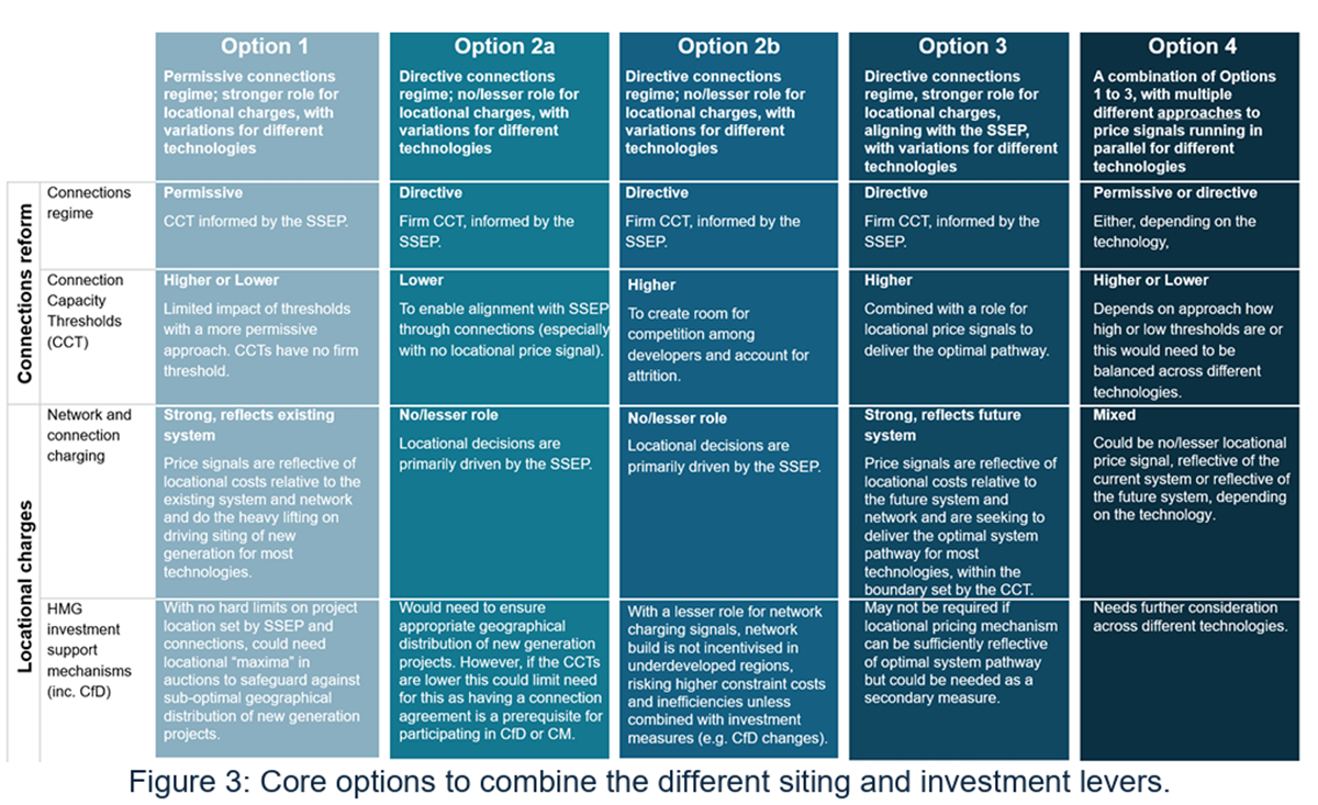 - reforming siting and investment levers to support delivery of the Strategic Spatial Energy Plan, alongside Ofgem’s Call for Input on network charges. The government noted a preference for doing this through Options 2a, 2b and 3 as Figure 2 below.