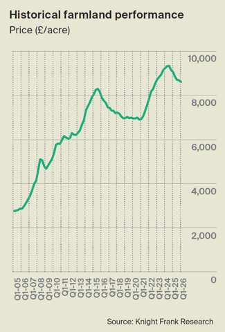 According to the latest results from the Knight Frank Farmland Index, which tracks the value of all types of bare agricultural land in England and Wales, prices dropped by just 0.9% to £8,622/acre in the first quarter of 2026.
