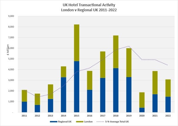 Knight Frank’s latest research records some £3 billion of hotel transactions to have taken place in 2022, some 30% below the five-year average, with the economic uncertainty stalling UK hotel investment volumes.