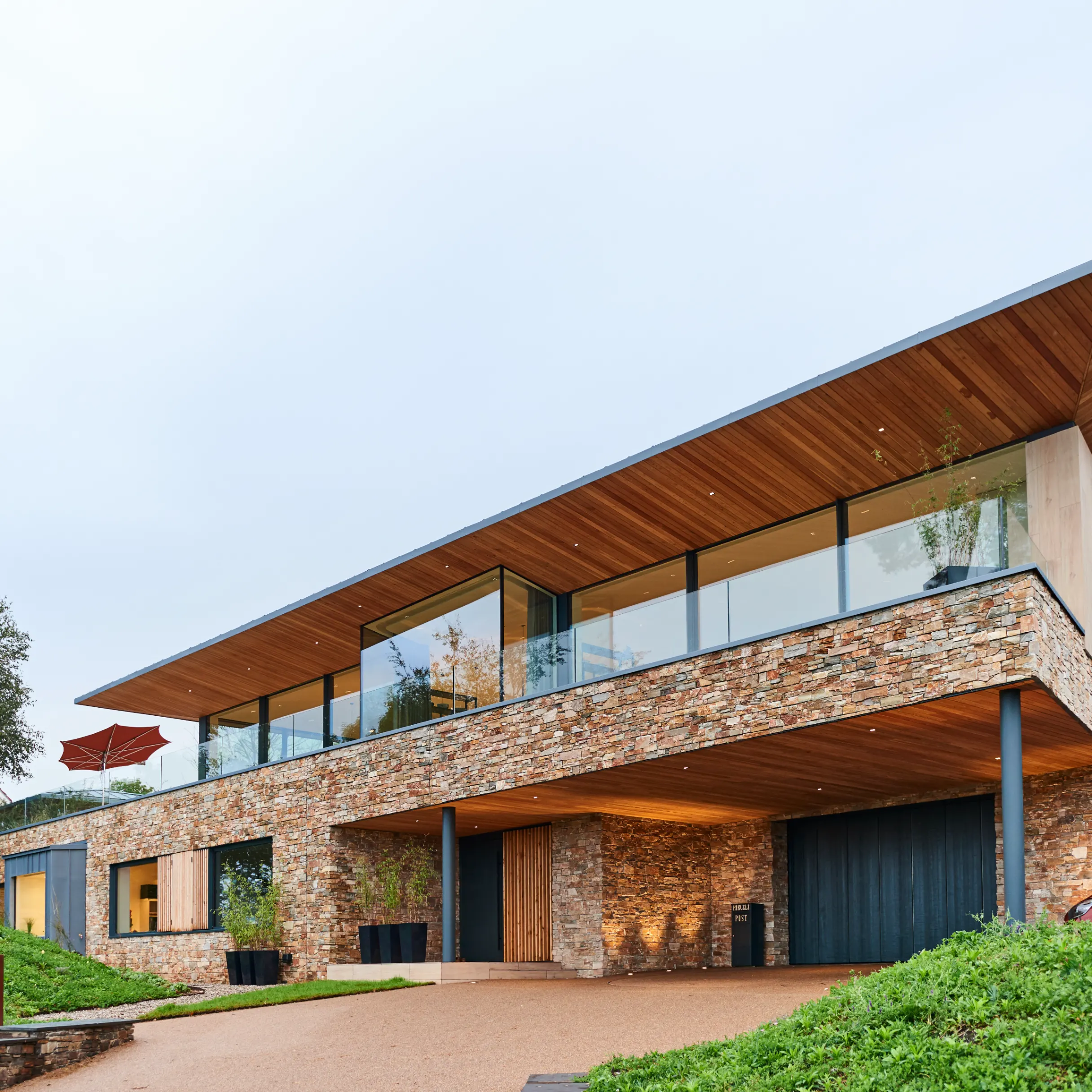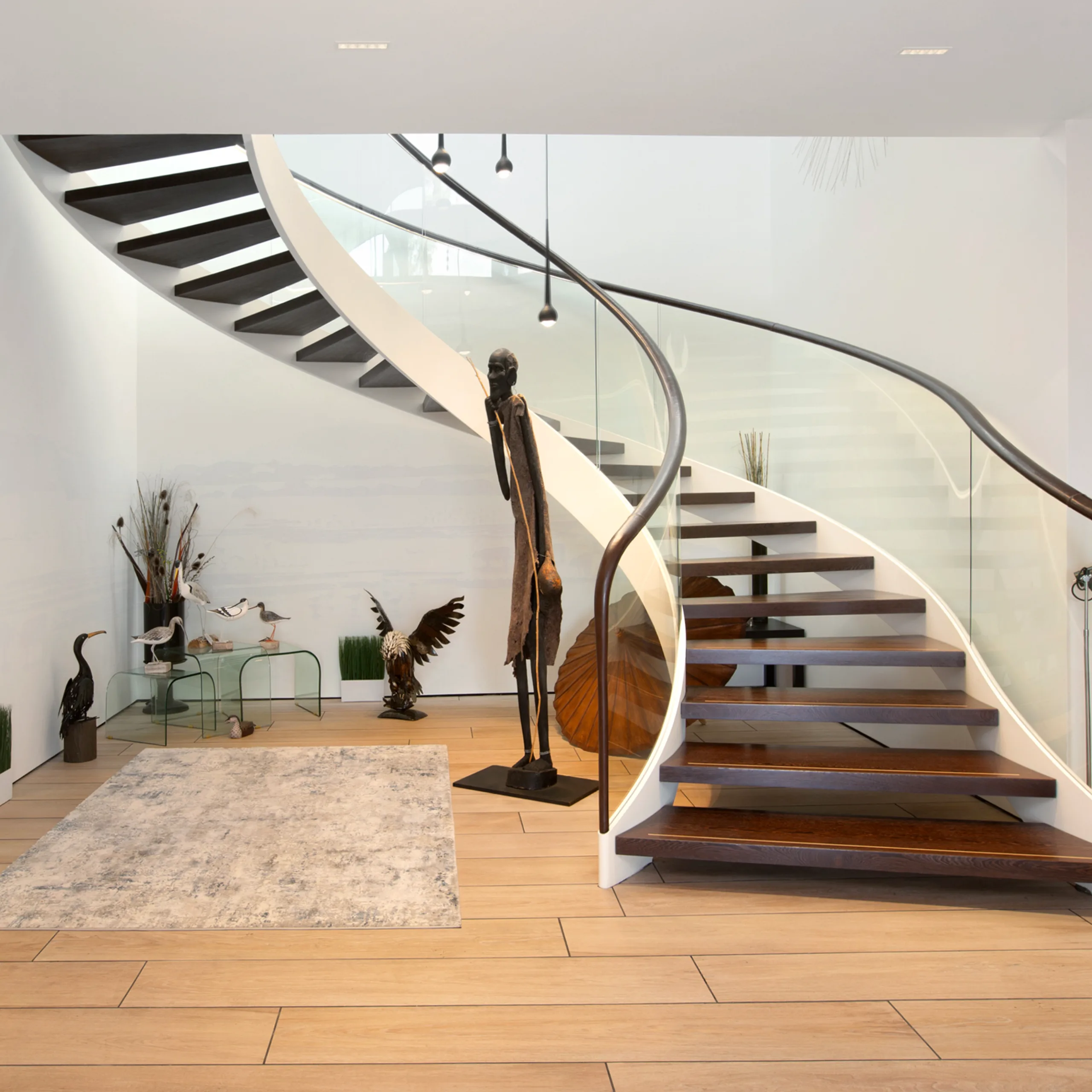 The result is open, light‑filled living spaces expanding across approximately 482 sq m, anchored by a structure that allows for its large expanses of floor‑to‑ceiling glazing framing the view. Achieving this was no mean feat: more than two years of searching for the perfect suppliers for each element of the home took them to Bologna in Italy for the hydraulic lift, Valencia in Spain for the porcelain tiles used in the natural material palette, and North Yorkshire for the showstopping helical staircase.
