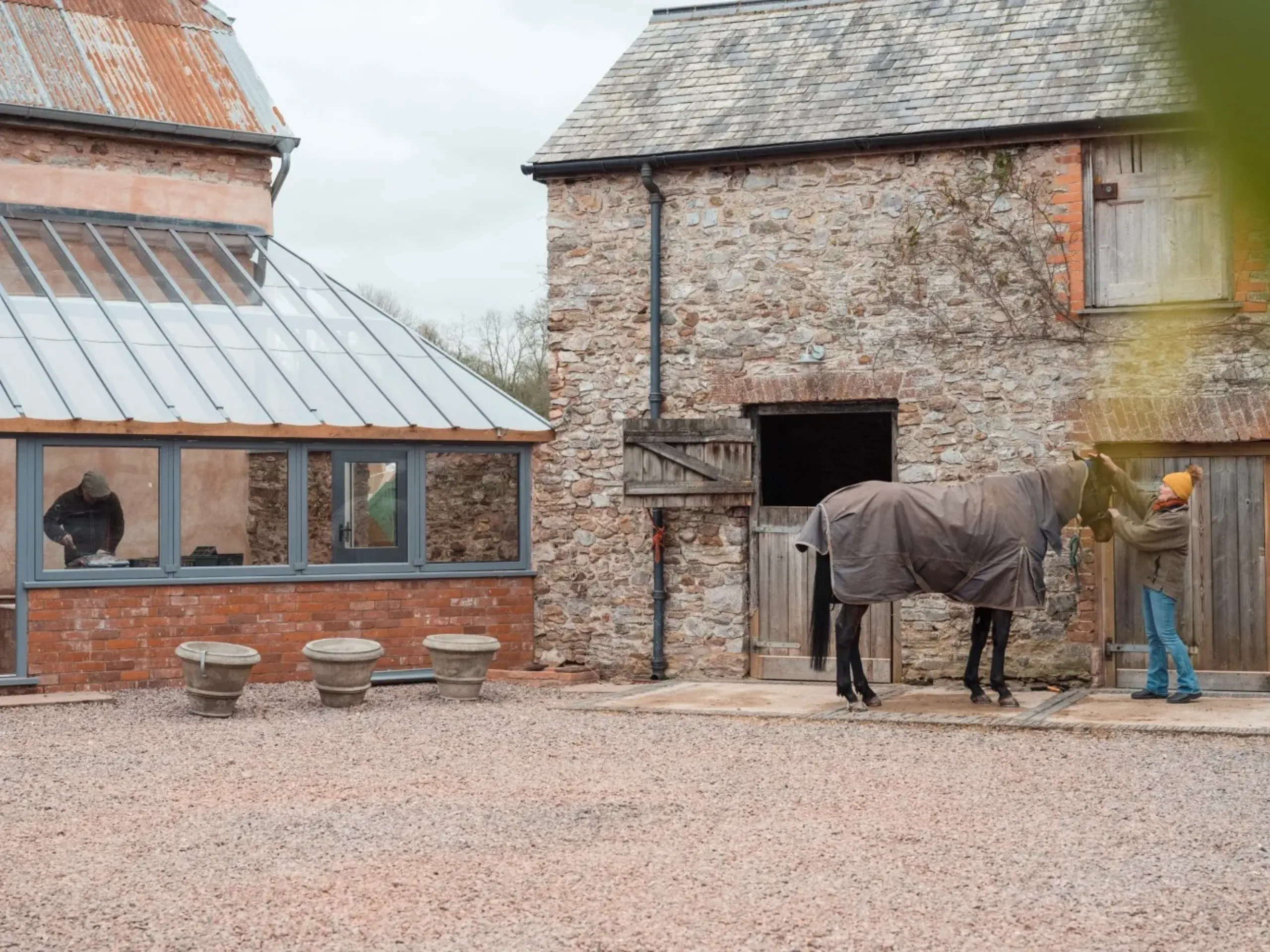 Linked to the house is the barn, currently used as a workshop and events space, which has undergone its own incredible transformation giving it a new lease of life while staying true to the essence of the original structure. “When modern farming took off many of these threshing barns got knocked down for newer buildings. Thank goodness this wasn’t one of them,” says Alasdair. Now a spacious, contemporary venue, able to comfortably seat 50, this unique setting opens up endless possibilities for a wide range of events. Along with the paddocks, stabling, cottage, as well as other outbuildings yet to be developed, it makes for a thoroughly versatile property that can lend itself to a variety of uses, subject to permissions.