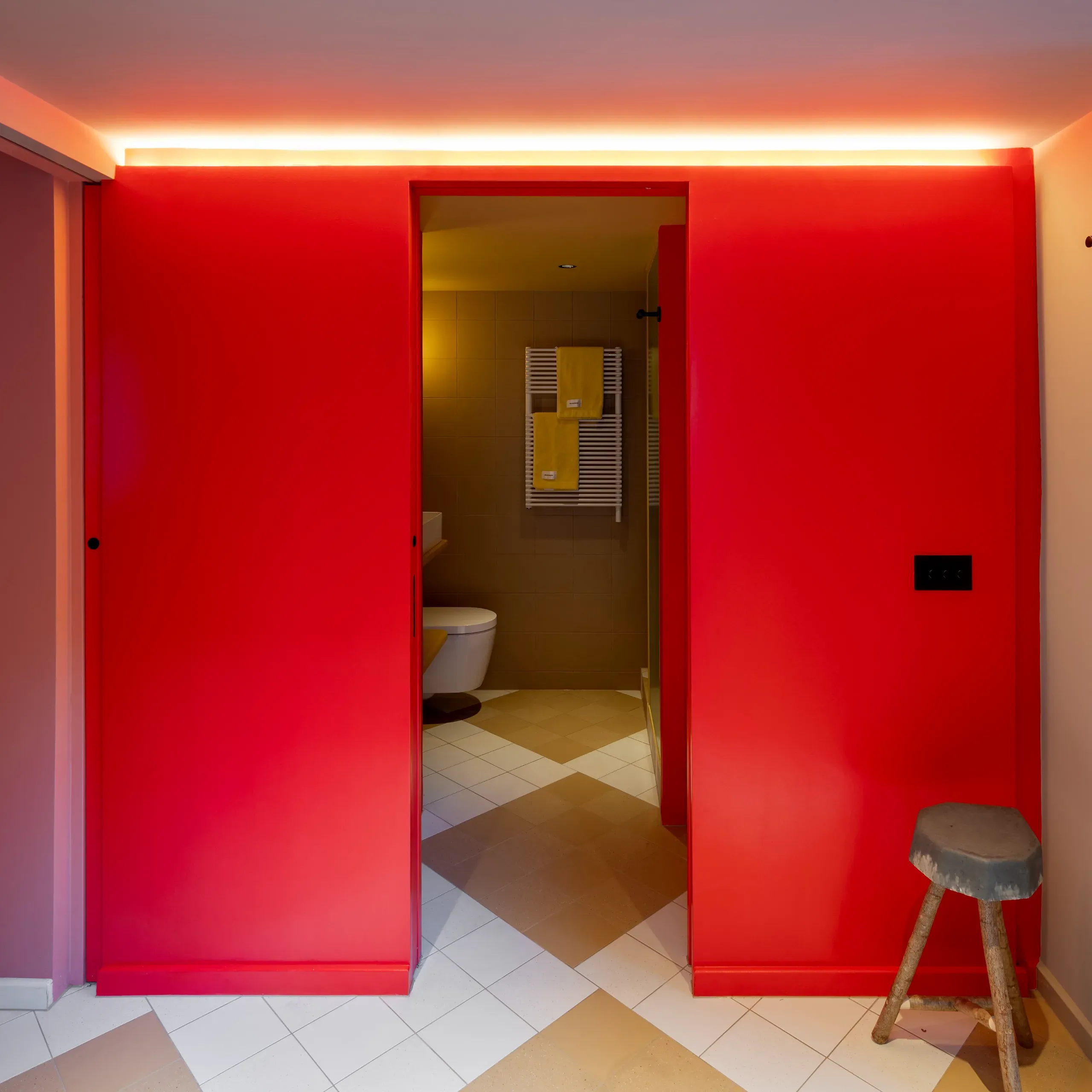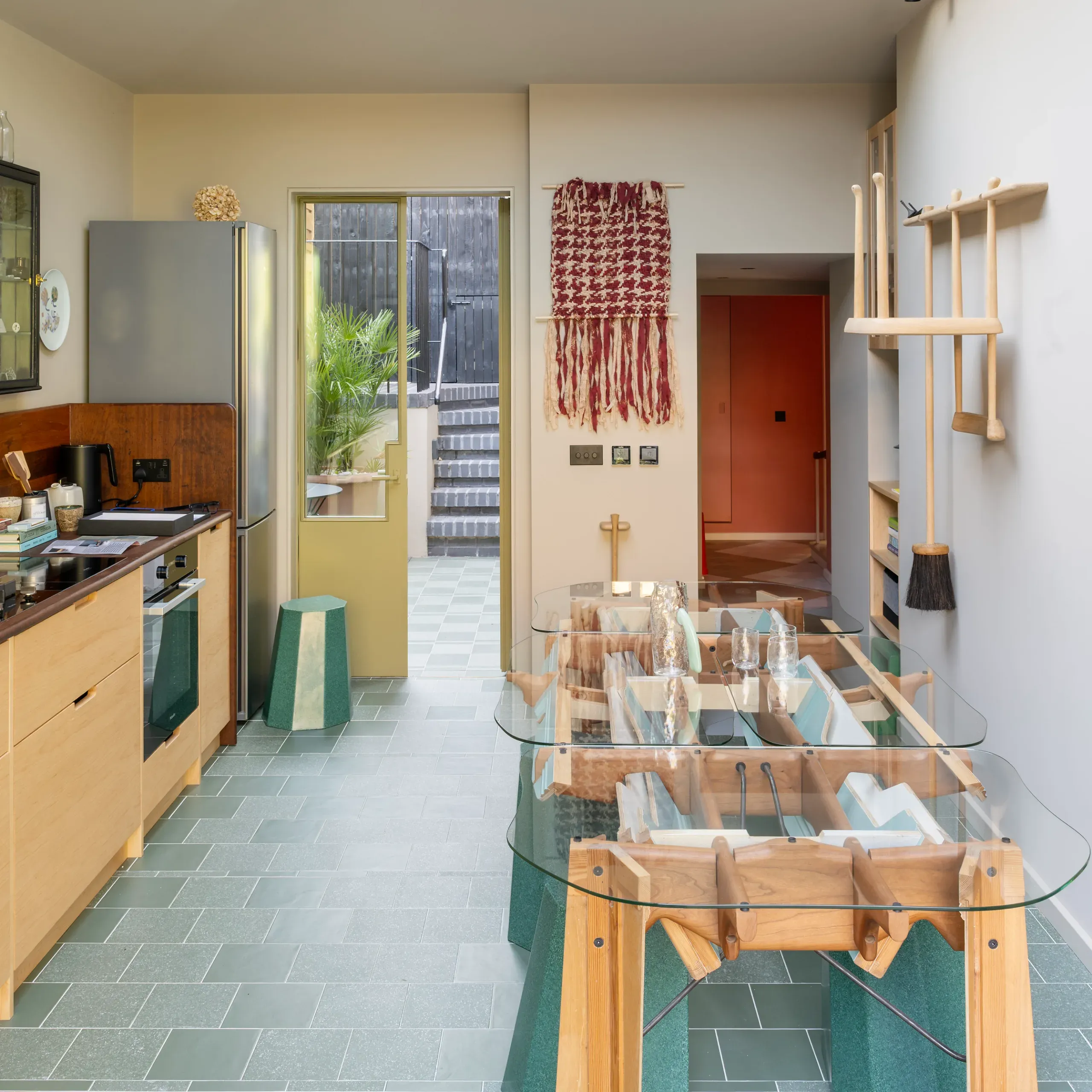 As Irenie explains, “You can have an amazing narrative, but you also need to be unlocking things spatially”. One of the most dramatic transformations took place on the lower ground floor, where a bold, bright-red box with playful sliding doors now leads through to a bathroom and laundry room. This reconfiguration allowed for the opening up the rear of the house, extending it out into the garden to create a light-filled, airy kitchen, a new social heart of the home.