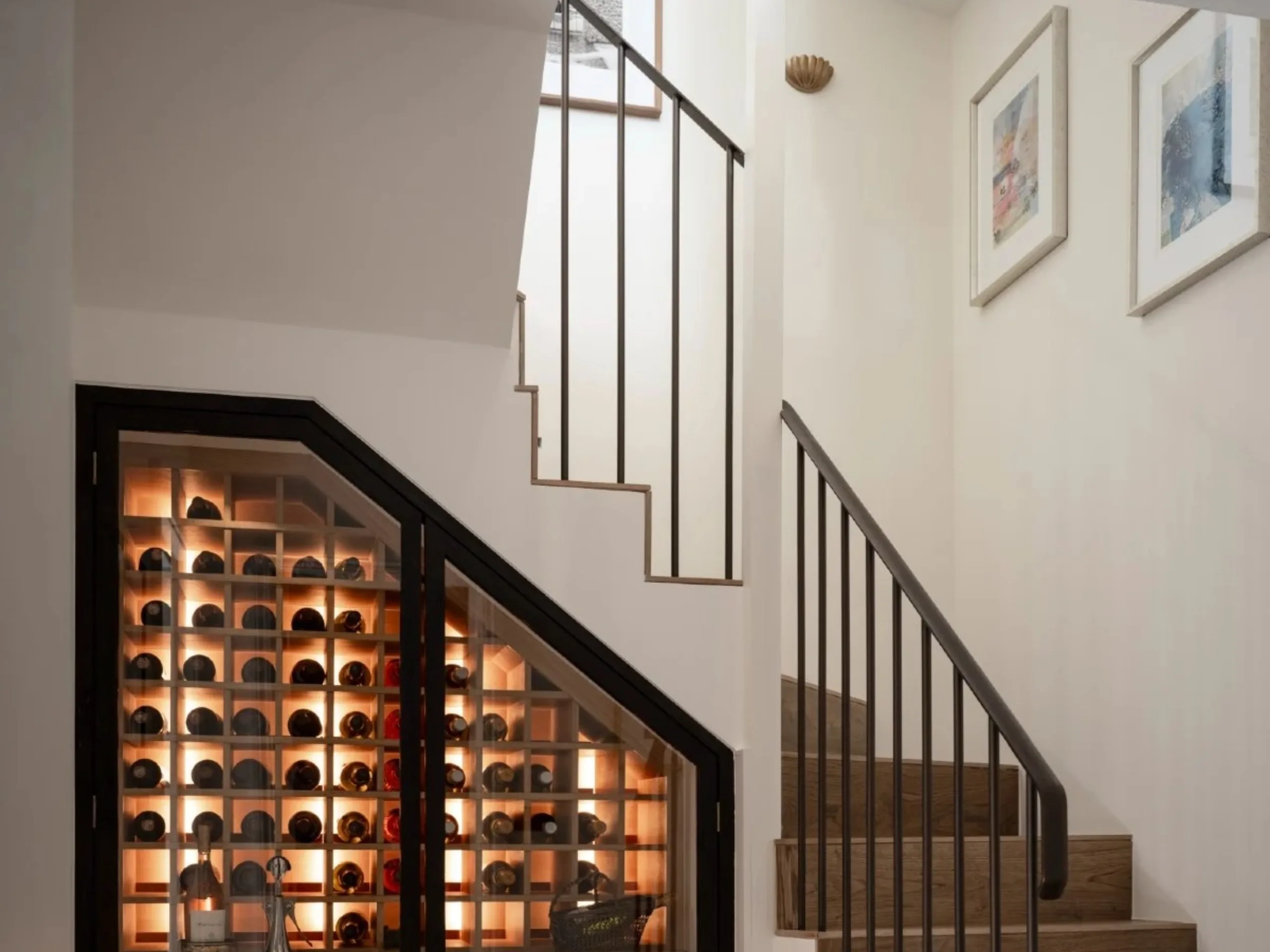 Natural light now floods the 1,800 sq ft, south-facing house through the bifold doors into the open-plan, bespoke kitchen and shines down through the cutout in the floor into the basement reception room. Perfect for entertaining, this space has a cinema system with a drop-down screen in the ceiling and surround-sound Sonos speakers, plus a wine cellar next door.