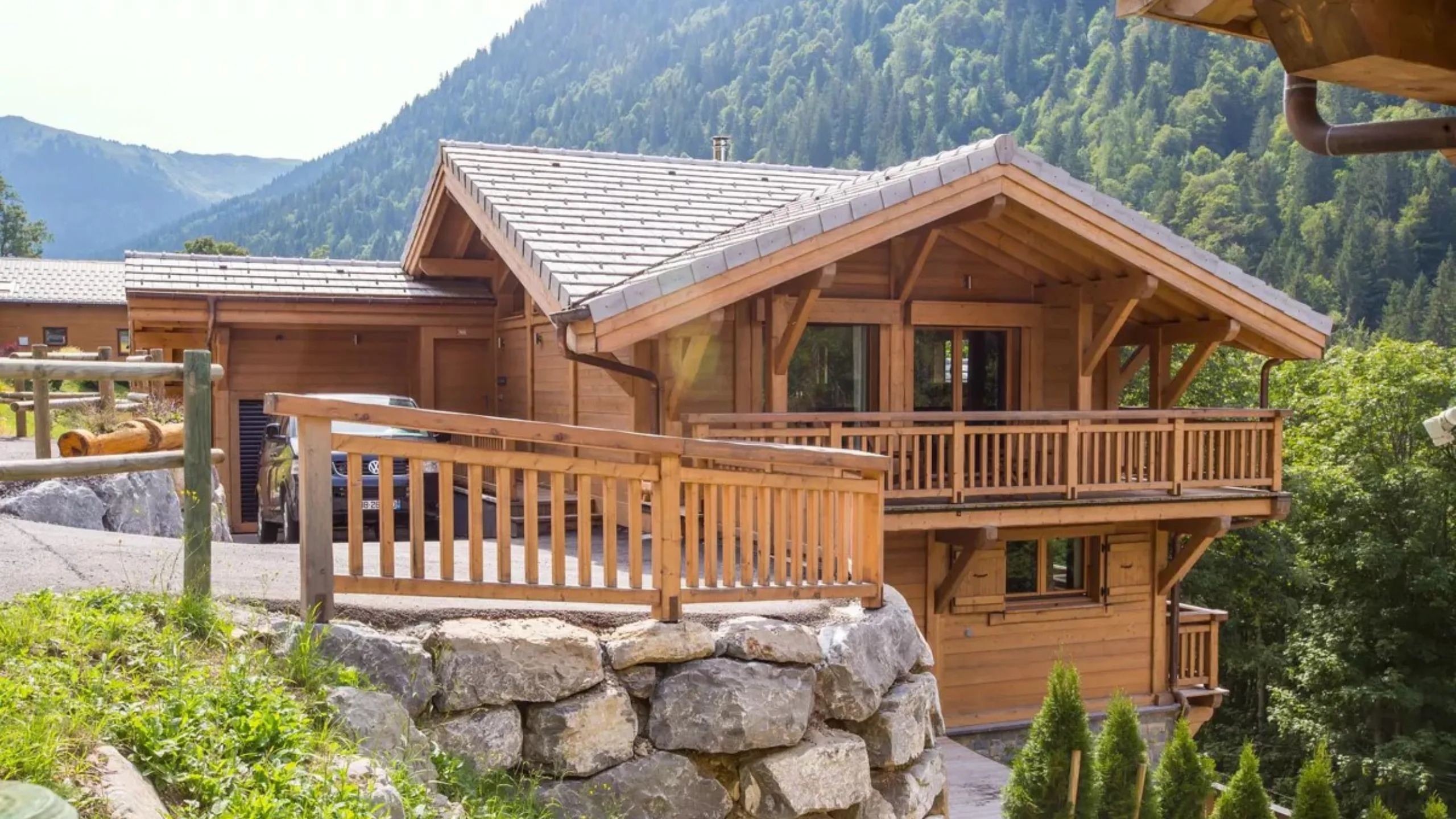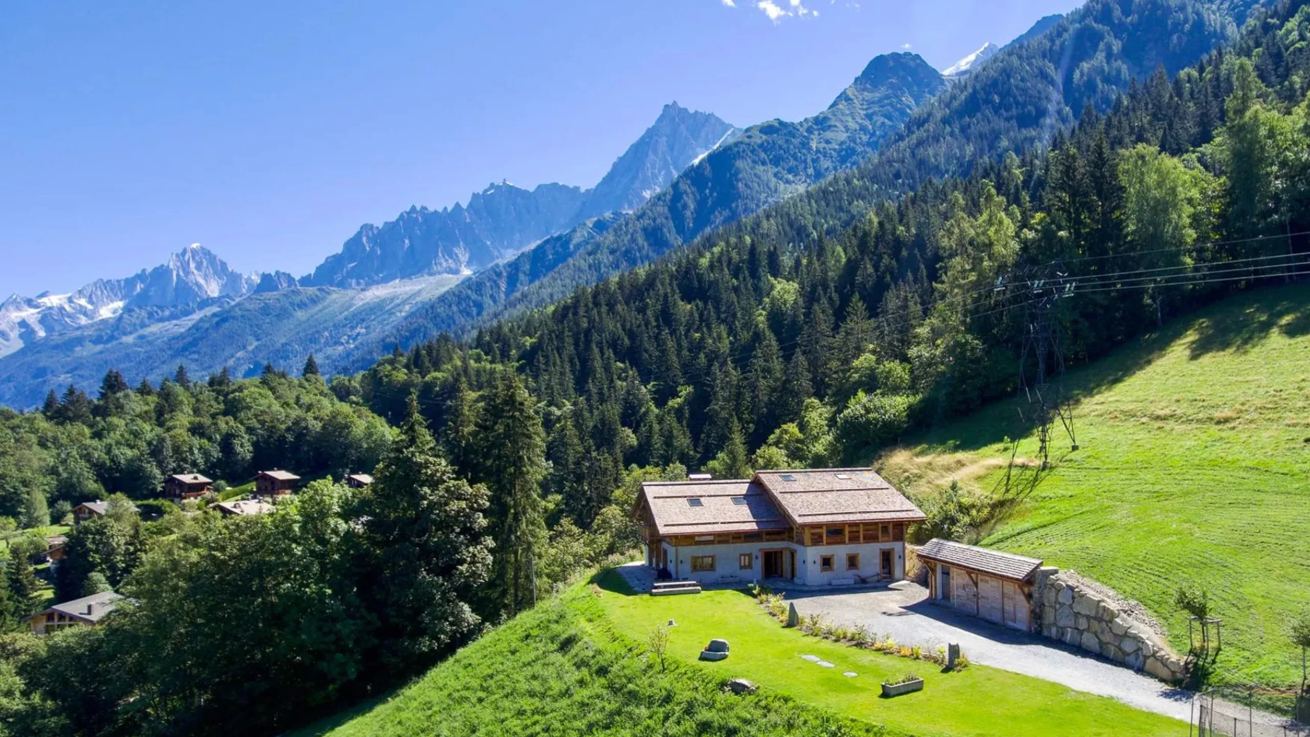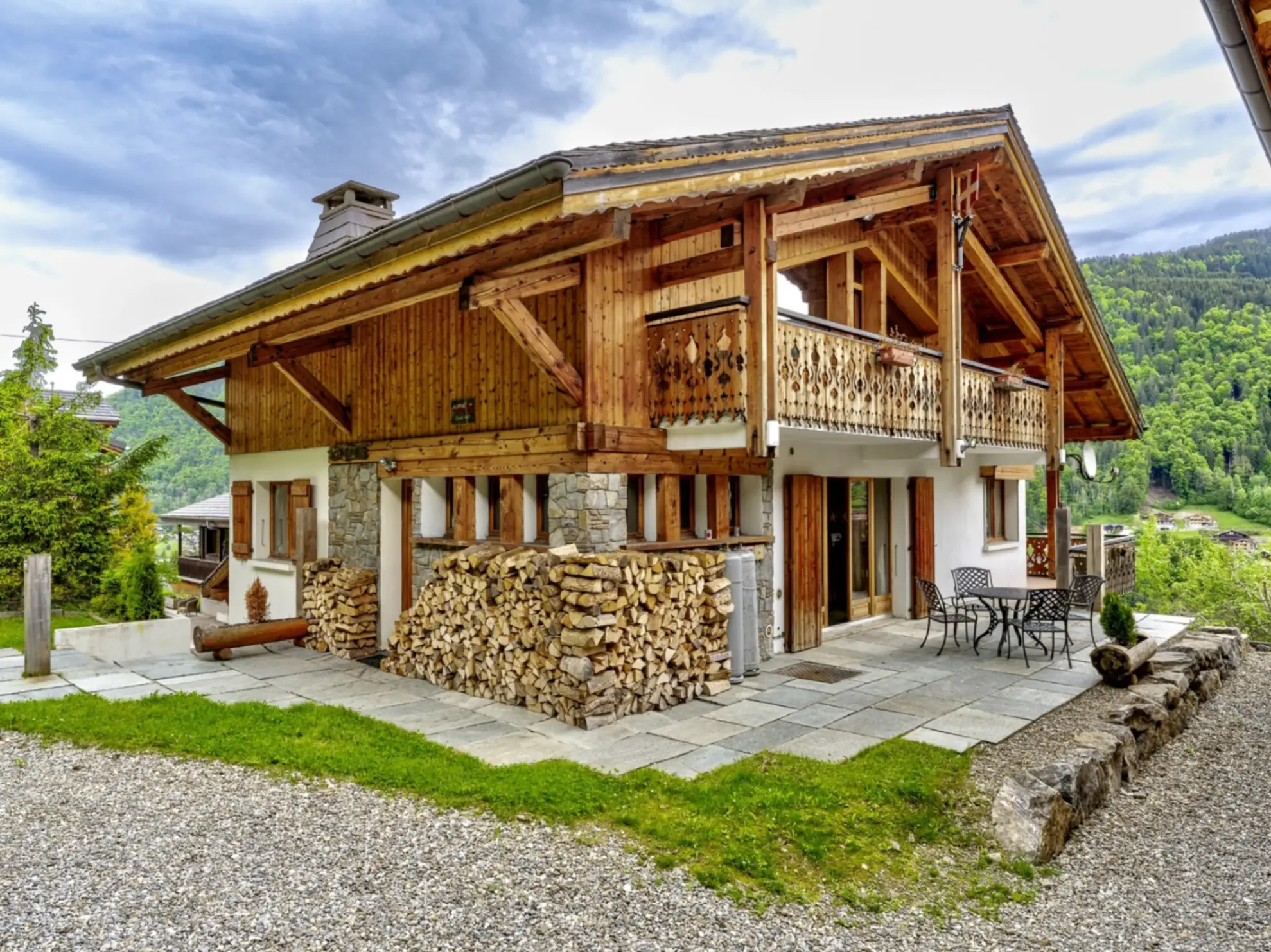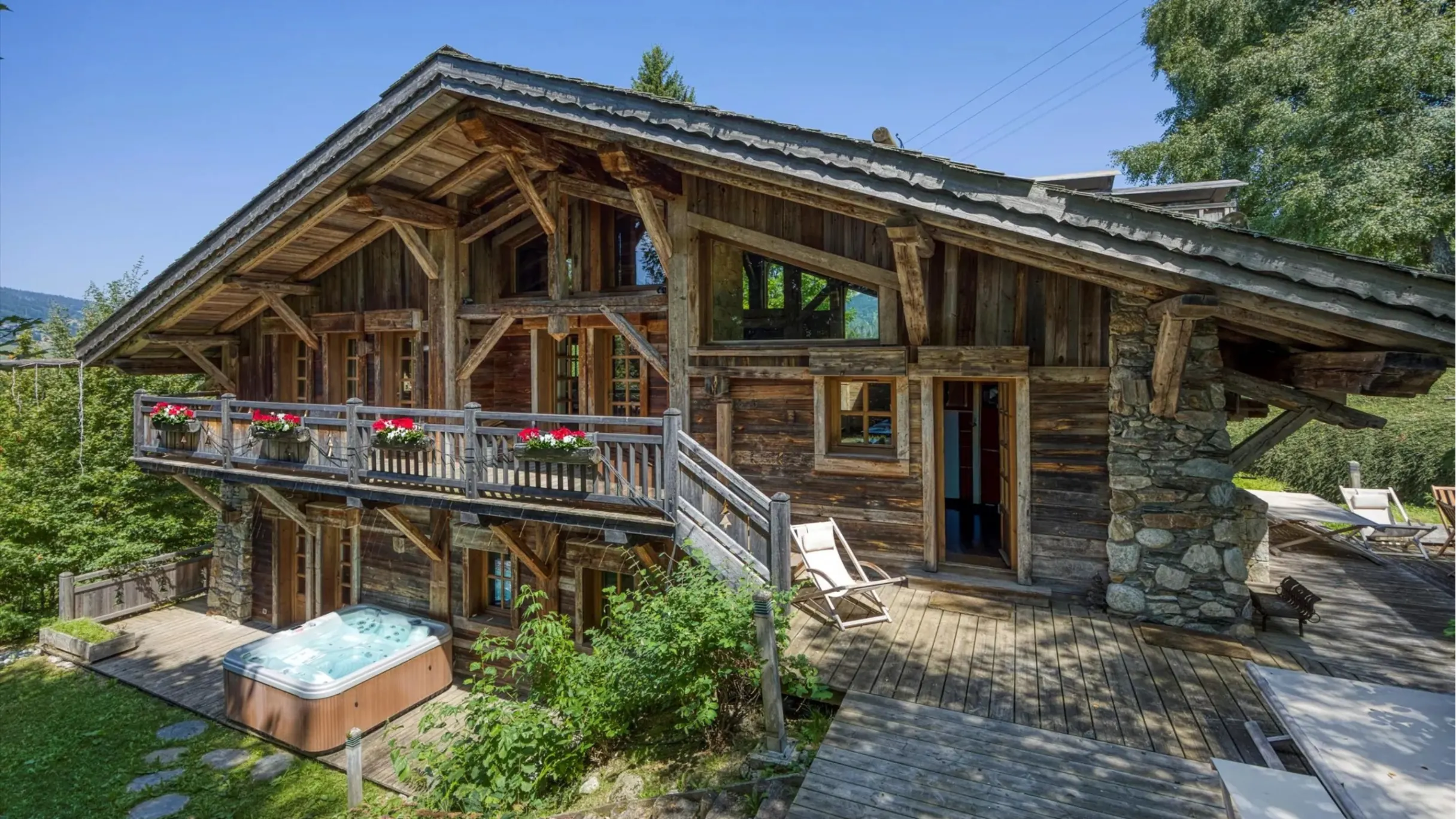 Featuring a flagstone terrace with fantastic views of the Fiz and the Chamonix Valley, with late summer sun, this superb five-bedroom chalet perched on the Les Houches hillside is €4,800,000.
