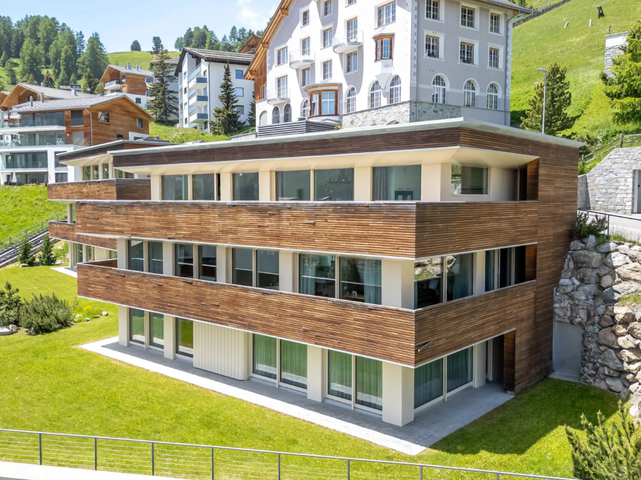 In St Moritz, where the traditional Alpine wooden style chalets give way to a mix of solid stone and contemporary homes, a modern chalet with seven bedrooms is an example of the properties available.