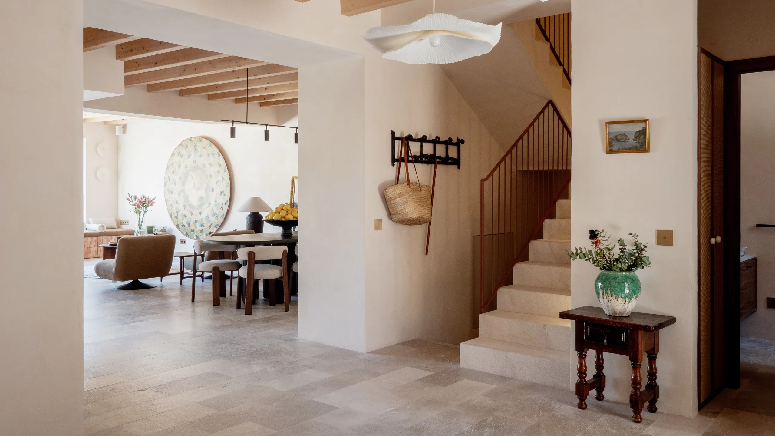 On this western coast in the buzzy town of Sóller, a beautiful four bedroom stone farmhouse is for sale at €2,750,000. The picturesque villa celebrates outdoor living and is designed around the stunning Tramuntana mountain views. The open-plan ground floor has earthy tones and pale wood beams to create a calming ambience. The state-of-the-art kitchen leads out seamlessly to a partially covered terrace, with an al fresco dining area and a saltwater swimming pool. Upstairs are three stylish en suite bedrooms, with the principal bedroom opening on to a private terrace.